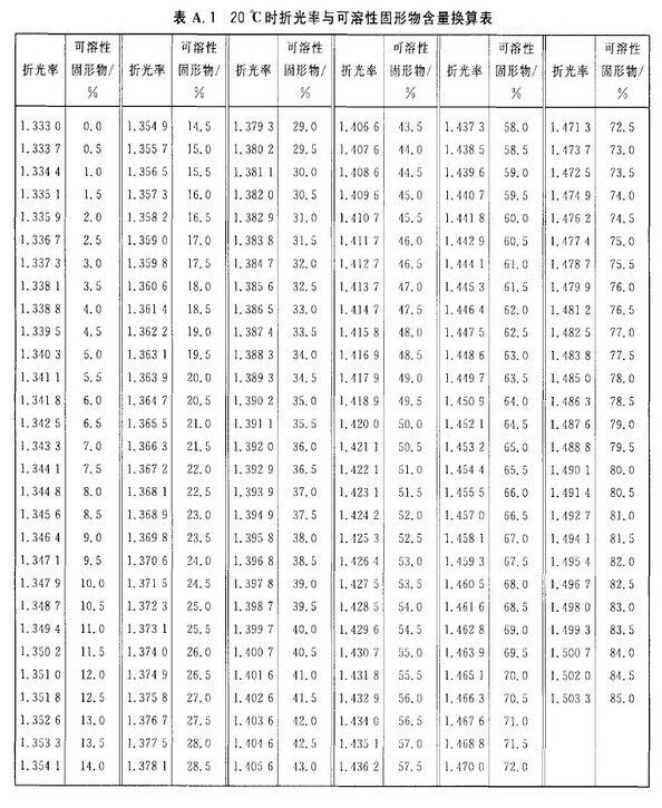 在20ºC用折光汁測量待測樣液的折光率,并用表A.1查得或從折光計(jì)上直接讀出可溶性固形物含量。