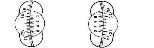 當放進存有被測溶液的試管后,由于溶液具有旋光性,使平面偏振光旋轉了一個角度,零度視場便發(fā)生了變化(如圖二a或c)。轉動檢偏鏡一定角度,能再次出現(xiàn)亮度一致的視場。這個轉角就是溶液的旋光度,它的數(shù)值可通過放大鏡(10)從度盤(11)上讀出。